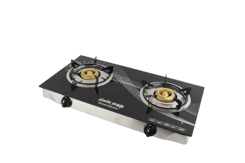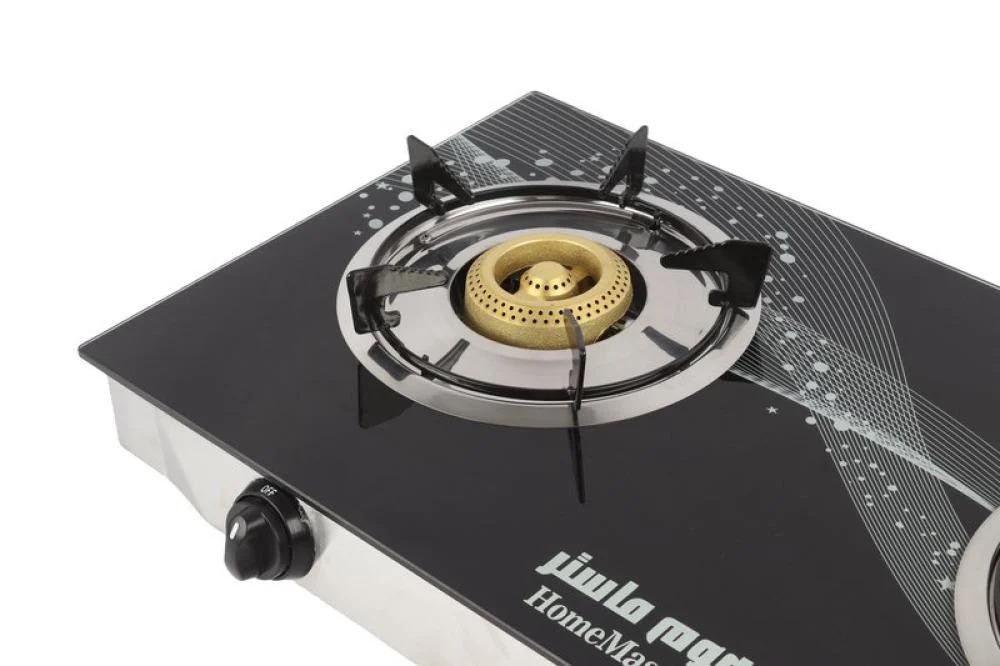 موقد غاز 2 شعلة مع سطح زجاجي مقابض مريحة لسهولة التشغيل تصميم بسيط وتقليدي مع شعلات موقد عالية الكفاءة مصنوعة من النحاس عالي الجودة أسود